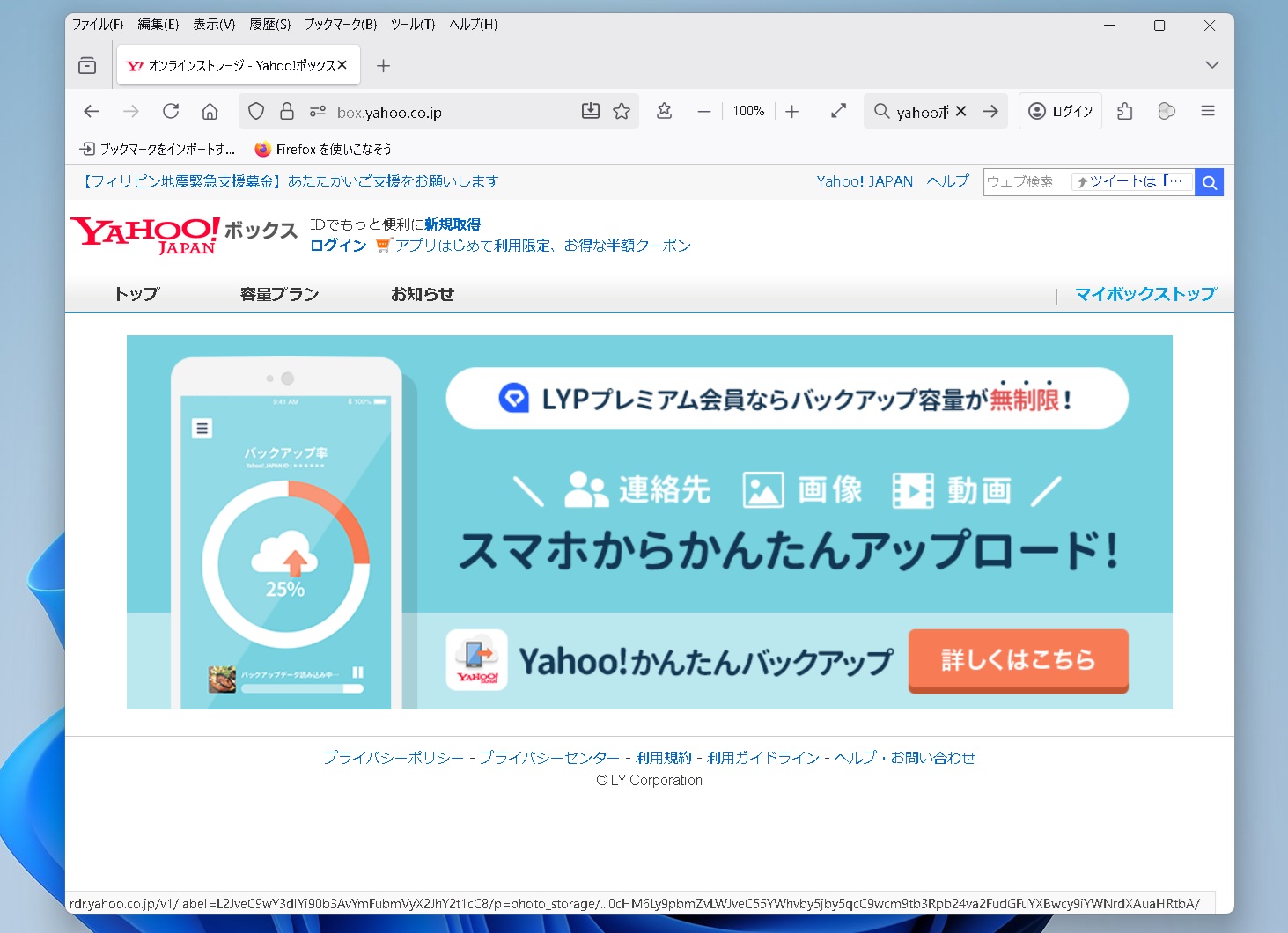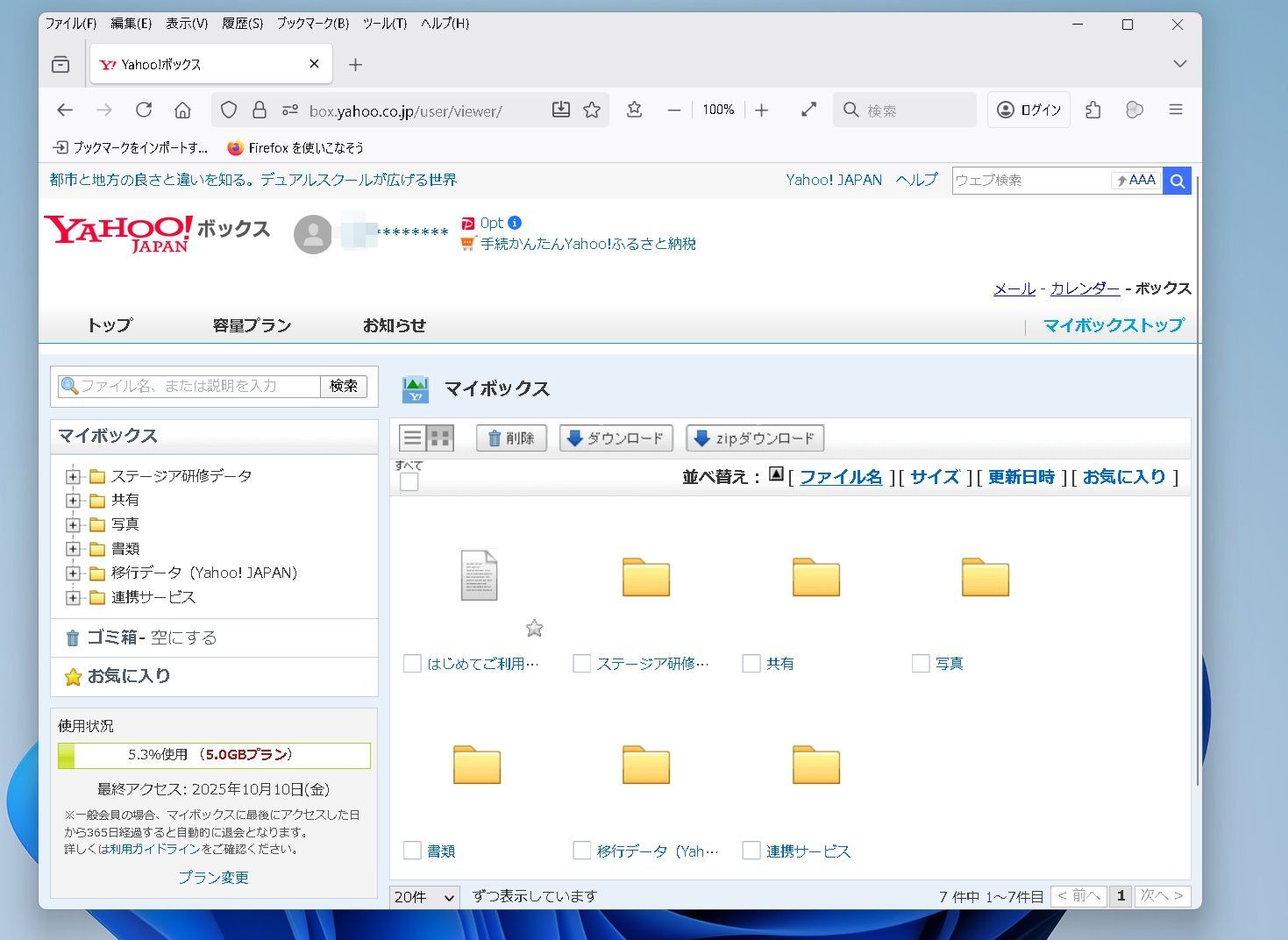 Yahoo!ボックス 右上のマイボックストップをクリック。